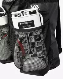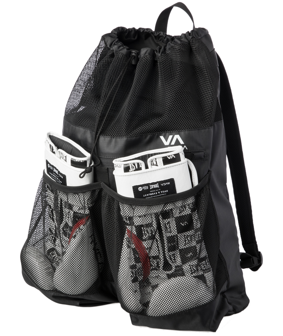 Whether you’re headed to the gym or training, the VA Sport boxing backpack has you covered. Made from water repellent polyester ripstop fabric, so your belongings stay dry and safe no matter what, this men’s backpack, part of our VA sport collection, features a large interior compartment with a drawstring closure for easy access and optimum security throughout. Two shoulder straps with adjustable webbing add comfort to this travel essential. Built with exterior zippered storage pockets for even more organization and two stretch mesh glove pockets at the side for all your needs. Finished off with our signature logo screen print t the front. Inspired by our mma and jiu jitsu ambassadors, this backpack is part of our RVCA sport collection, a premium line of workout clothes and associations for all your gym and training sessions.