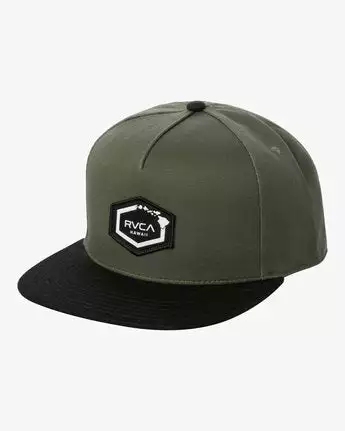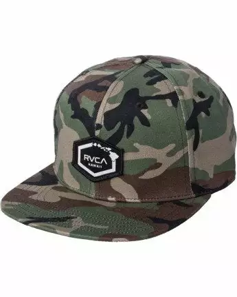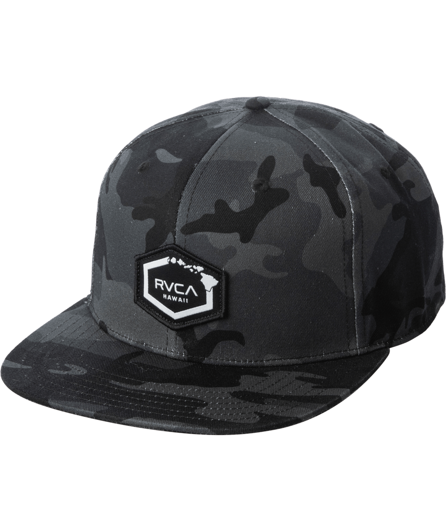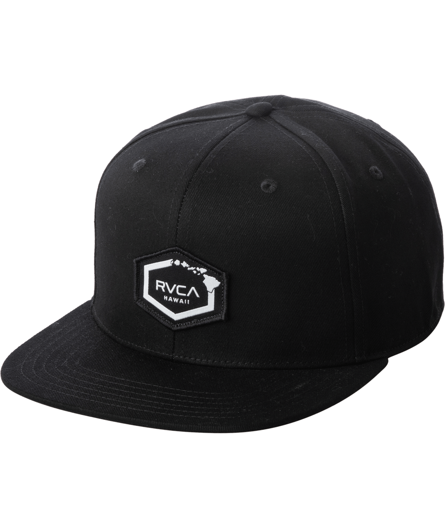 Mid Fit. Structure 5 panel snapback hat. Front Hawaii patch logo. RVCA flag label at back.