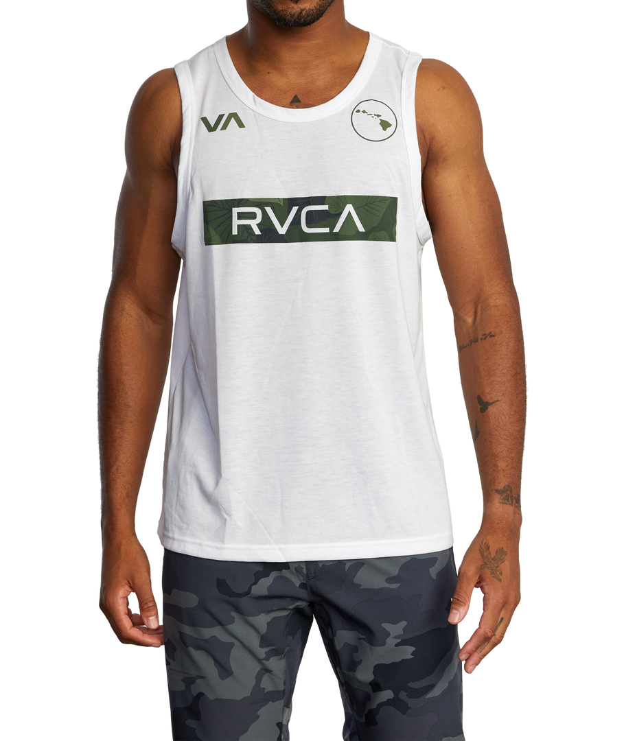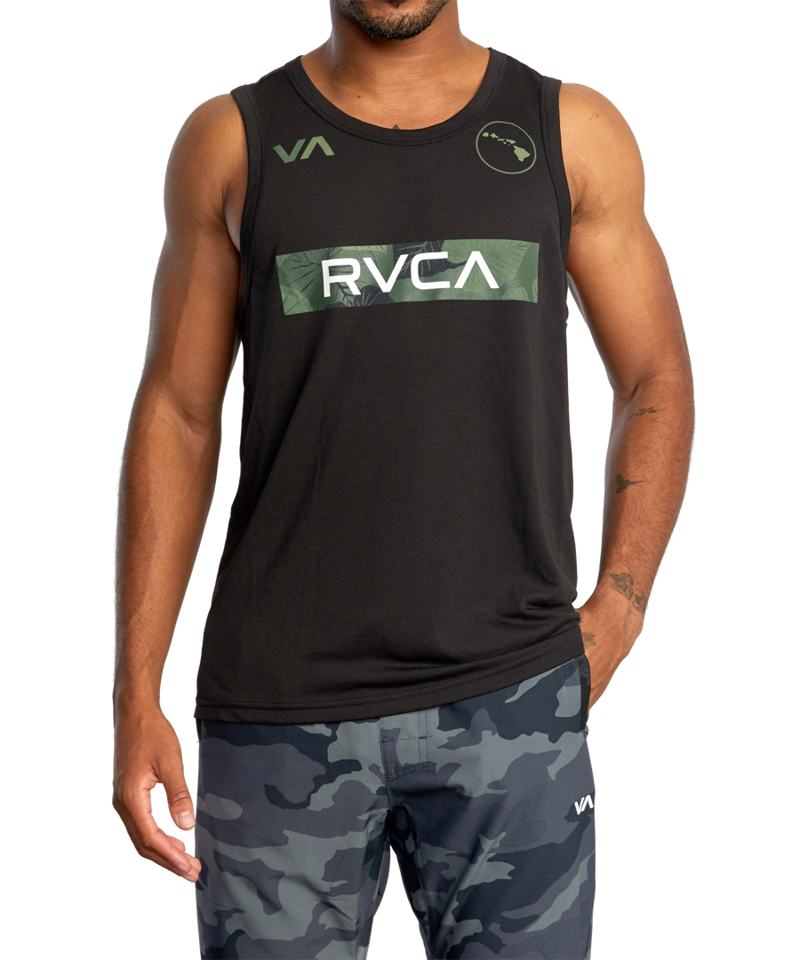 The RVCA Hawaii VA Box fill tank top features custom Hawaii collection prints throughout for a bold look. Made from soft jersey fabric, this lightweight tank top is built with a scoop neckline and screened inside neck for a comfortable fit throughout.