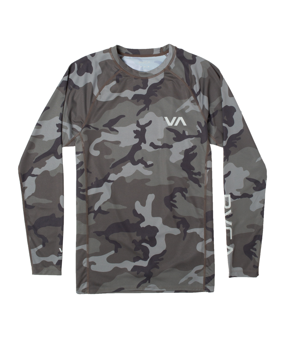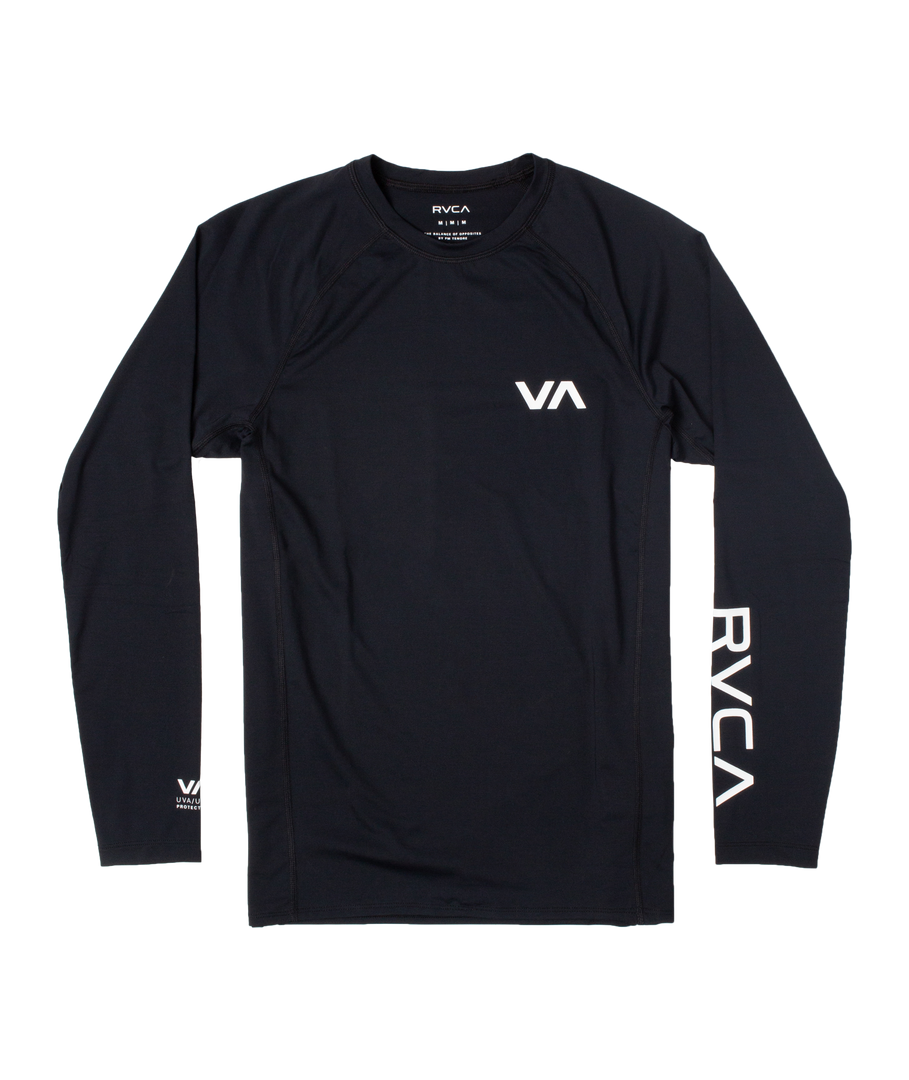 The RVCA Solid Long Sleeve Rashguard is a long sleeve raglan surf top with RVCA and VA screenprints and allover flatlock stitching.
