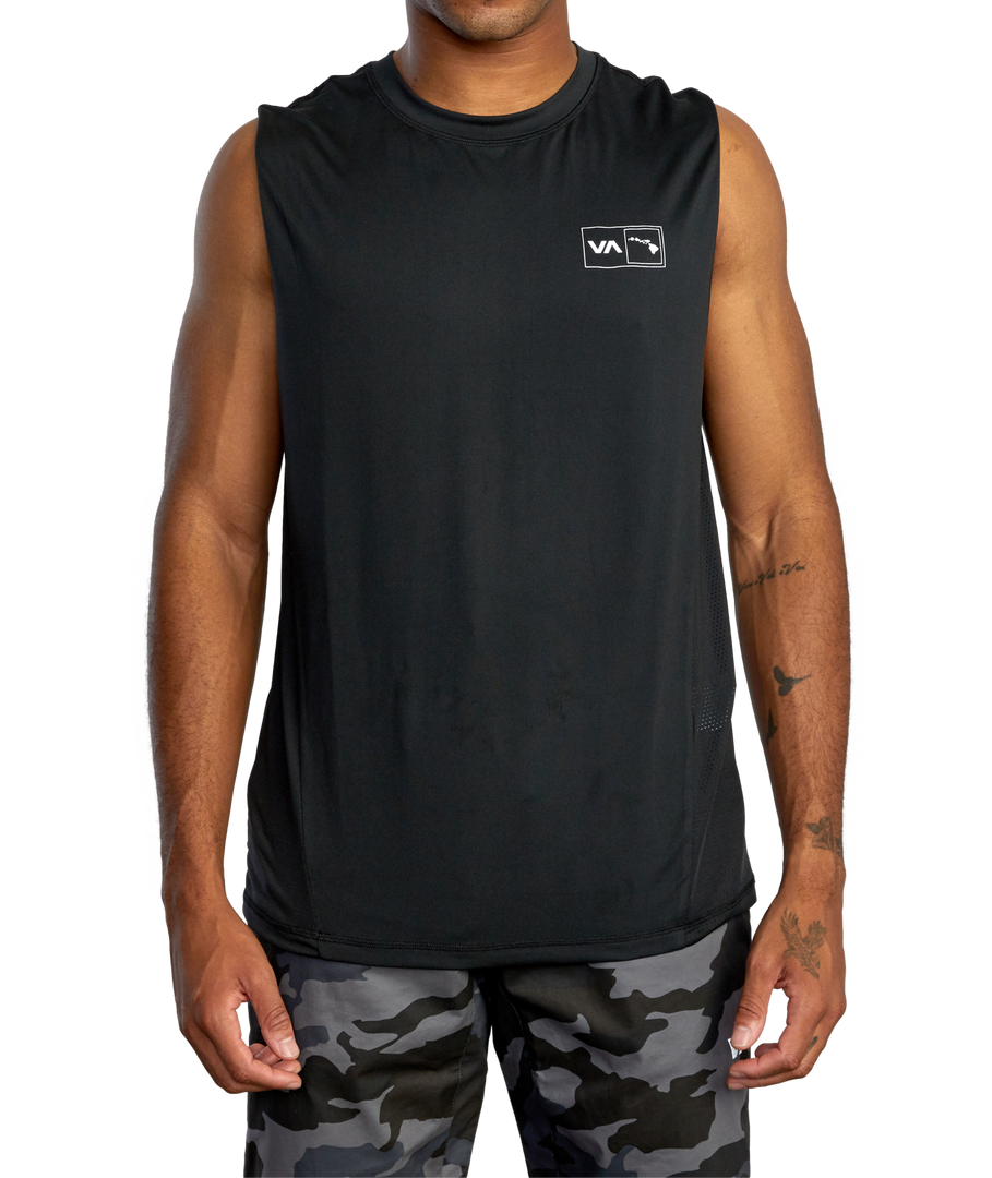 The RVCA Hawaii Sport Vent Muscle Tank Top keeps you going through any workout. Made from eco-conscious 4-Way stretch polyester fabric with perforation and mesh gussets at the side and back for breathable comfort throughout. This men’s performance muscle tank features a crew neckline and VA RVCA prints throughout.
