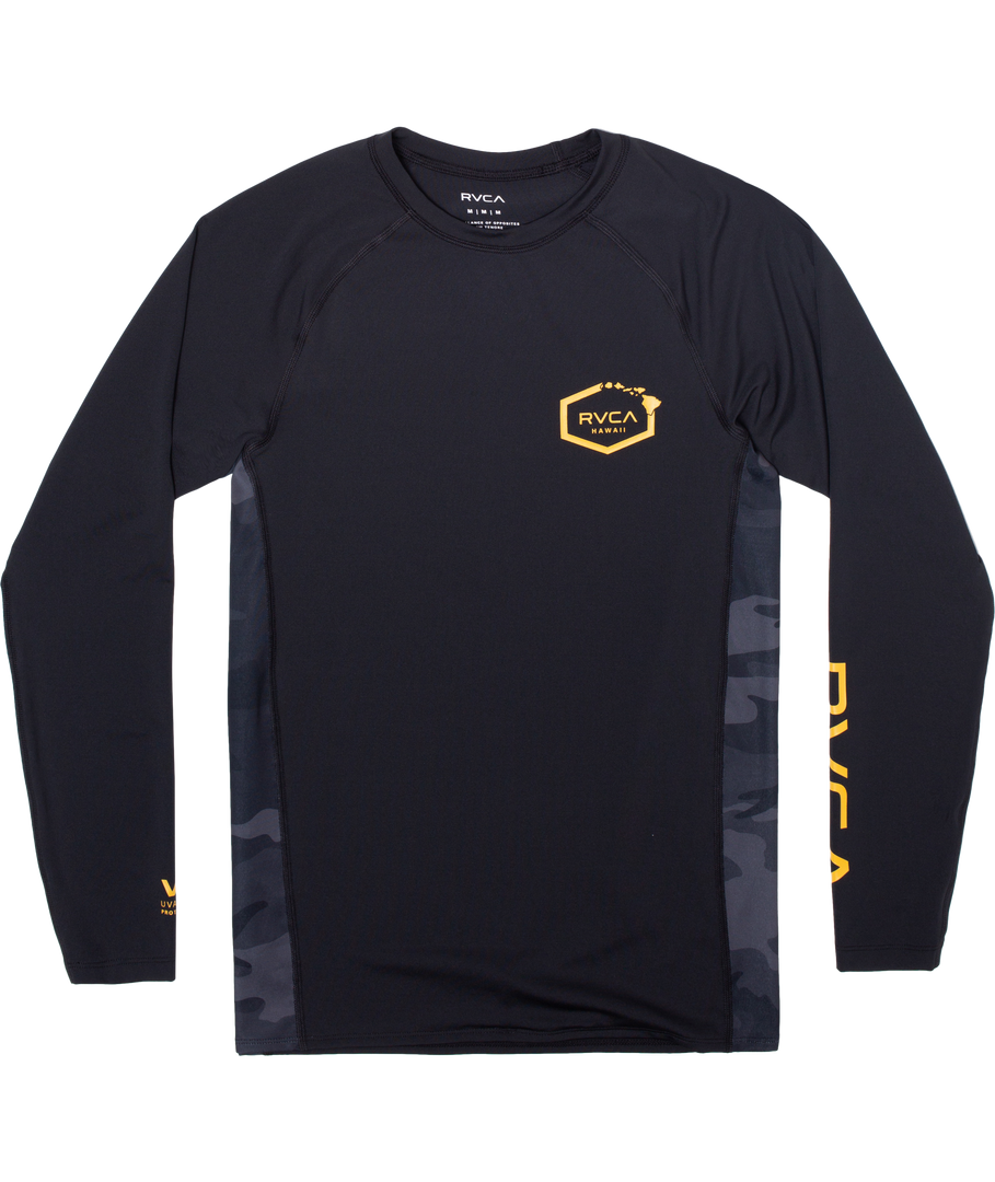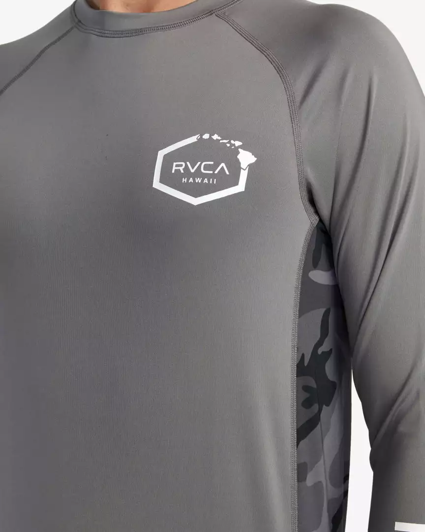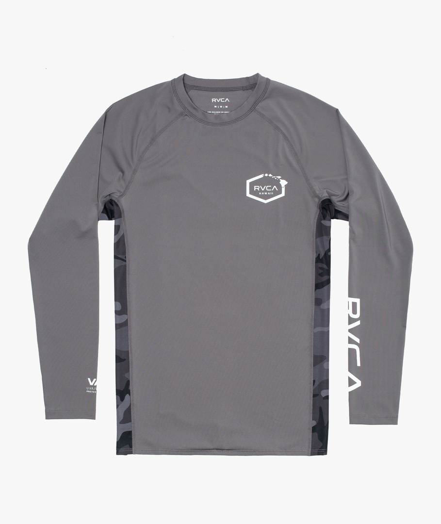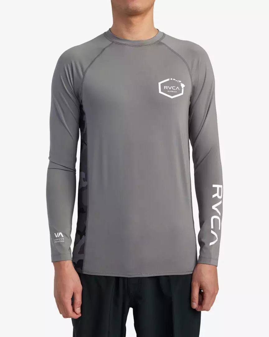 Stay sun protected in style in the RVCA Island Hex Long Sleeve Rashguard. Made from recycle poly stretch with built-in UVA/UVB protection, this men’s rashguard features long raglan sleeve, a crew neckline, internal back bottom hem key loop and RVCA prints throughout.