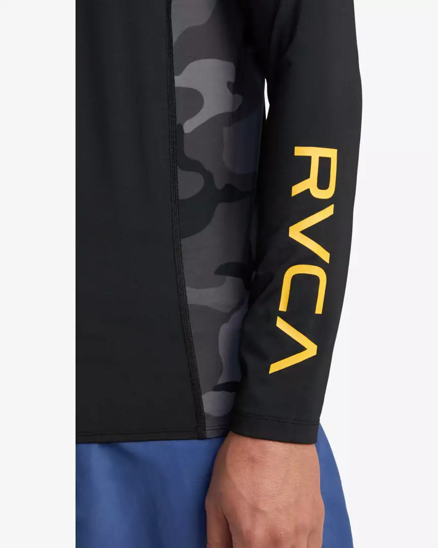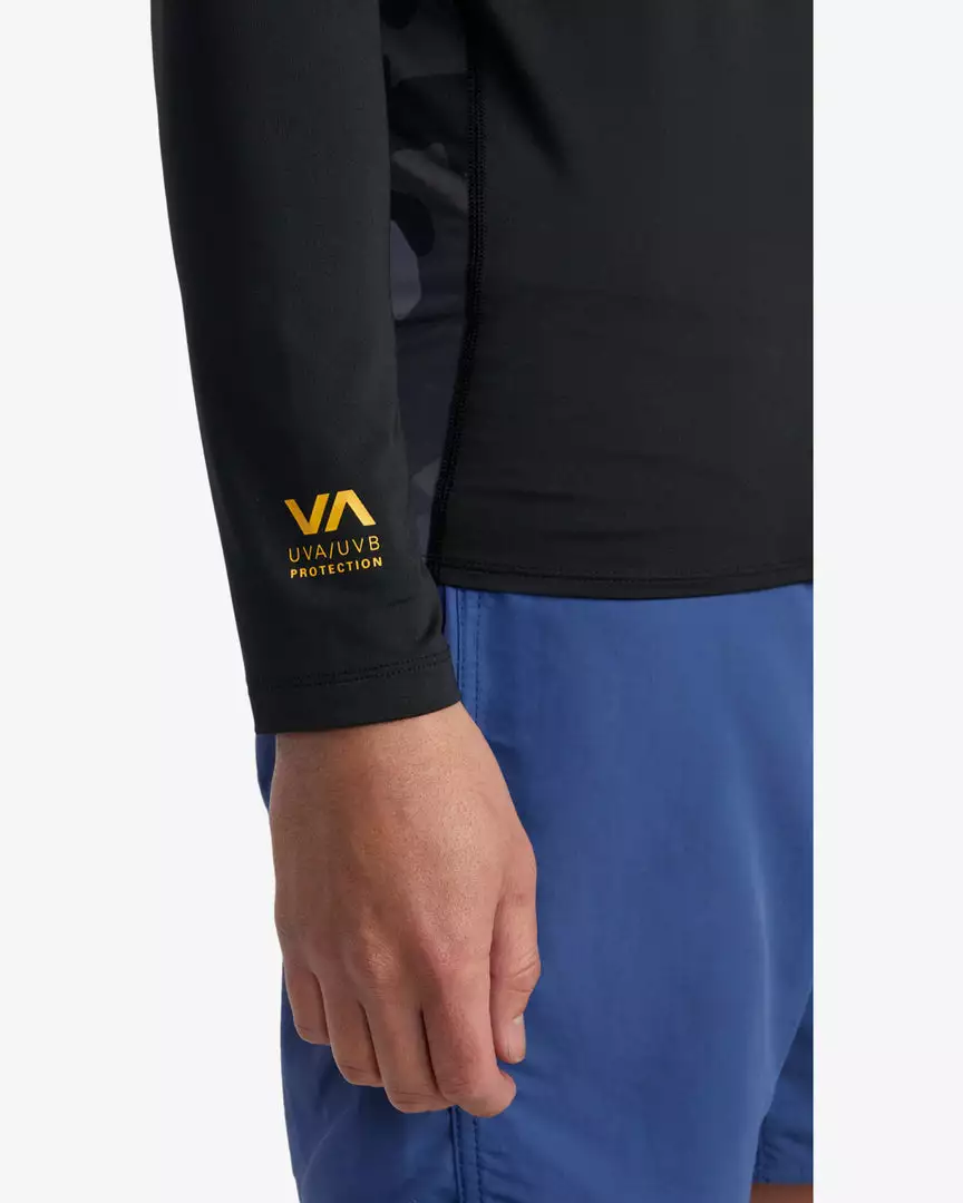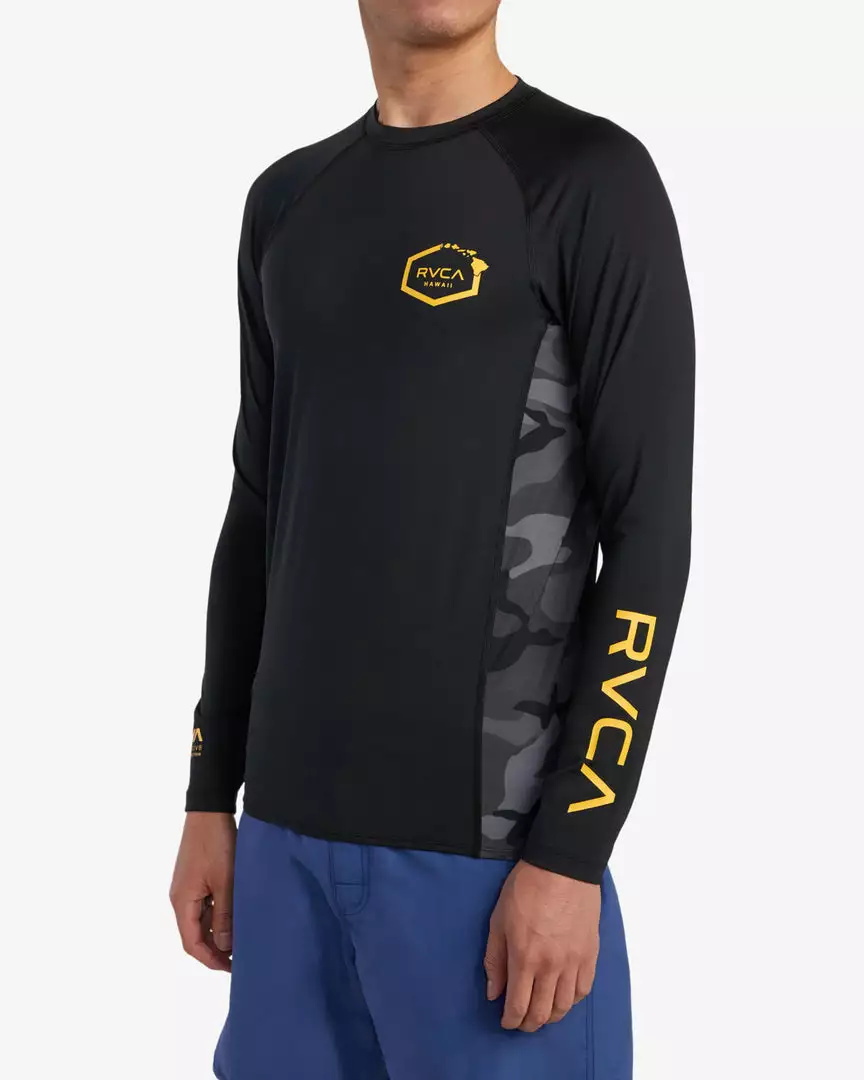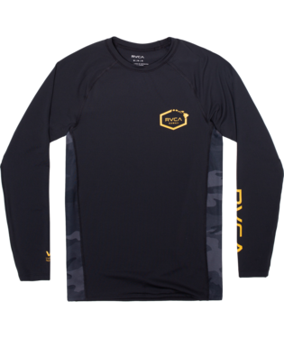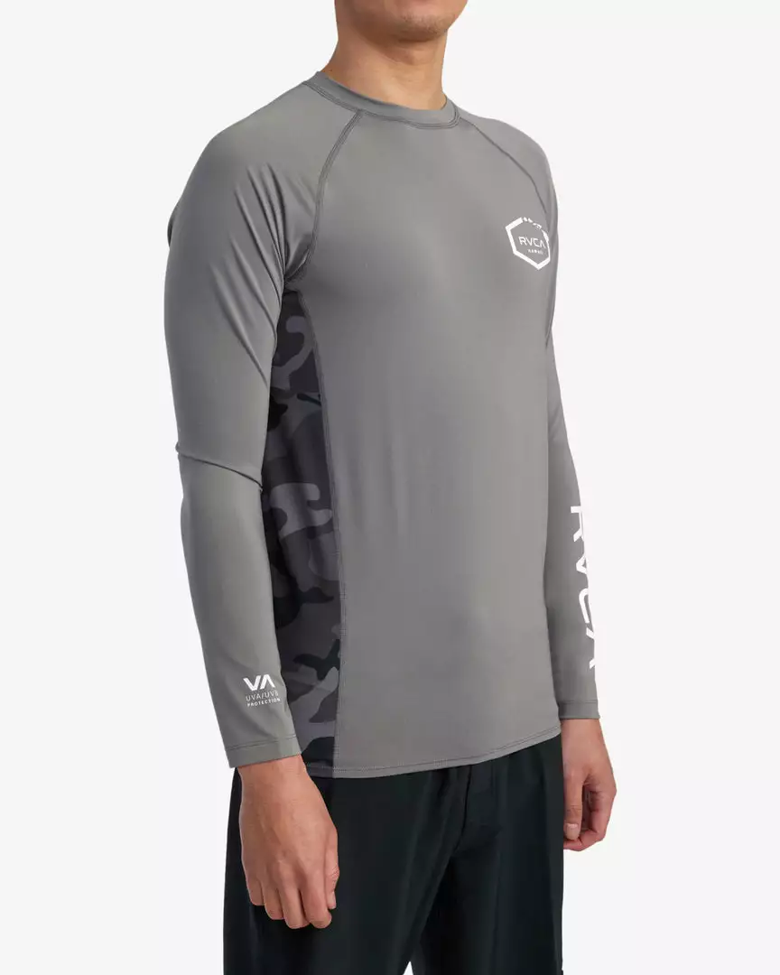 Stay sun protected in style in the RVCA Island Hex Long Sleeve Rashguard. Made from recycle poly stretch with built-in UVA/UVB protection, this men’s rashguard features long raglan sleeve, a crew neckline, internal back bottom hem key loop and RVCA prints throughout.