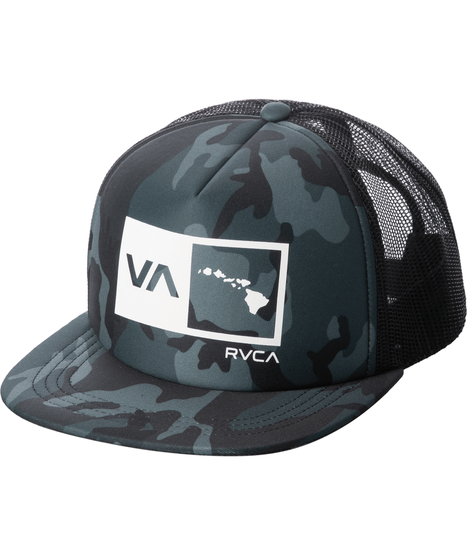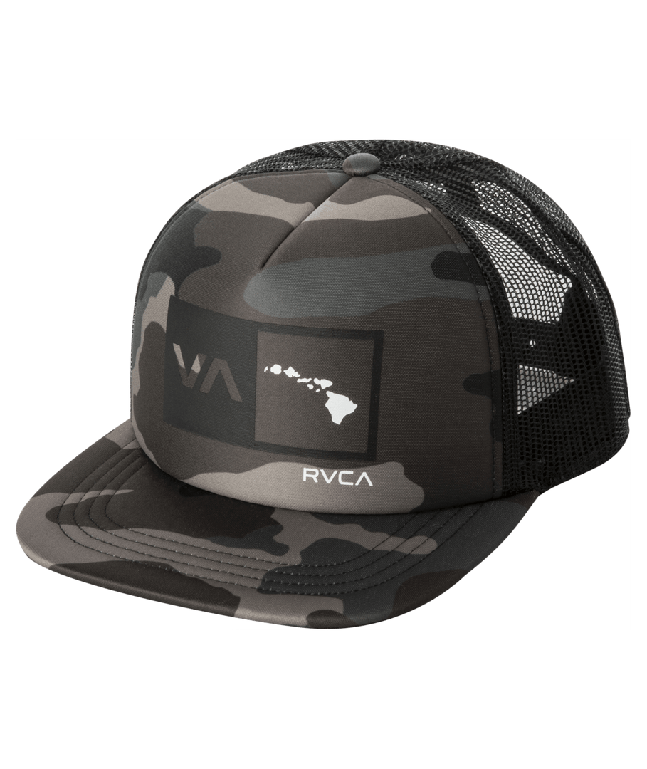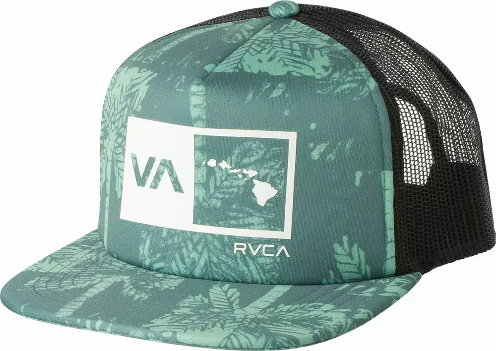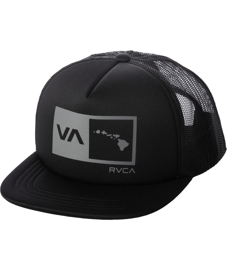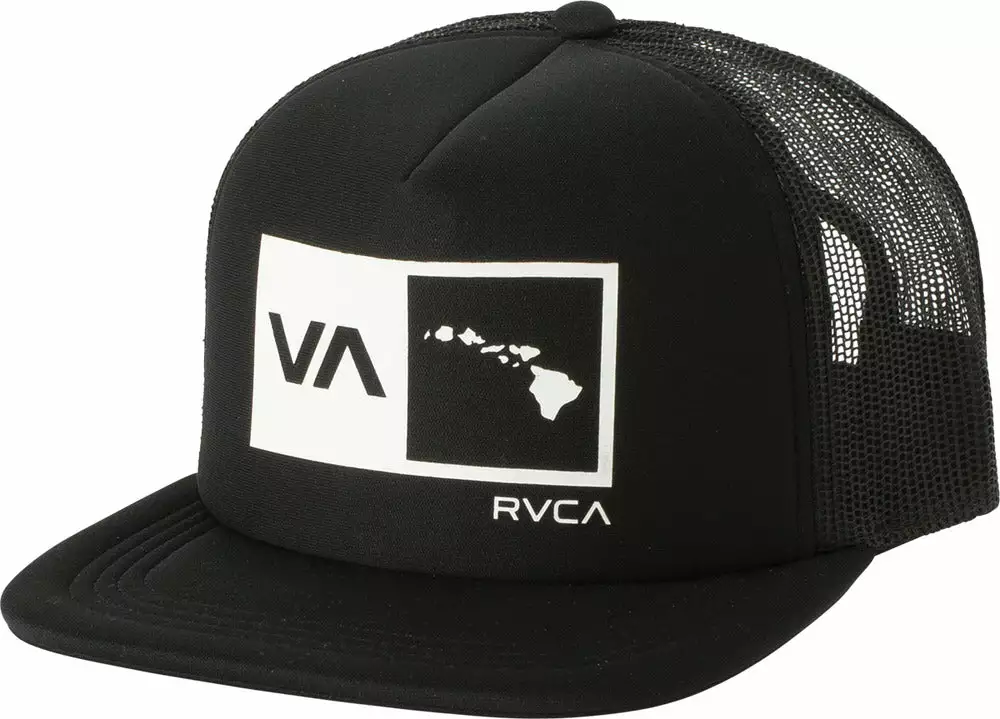 The RVCA Islands Balance Box Foam Trucker Hat is a deep fit, 5-panel mesh back trucker hat with a screen printed front logo and a RVCA flag label at the back.
