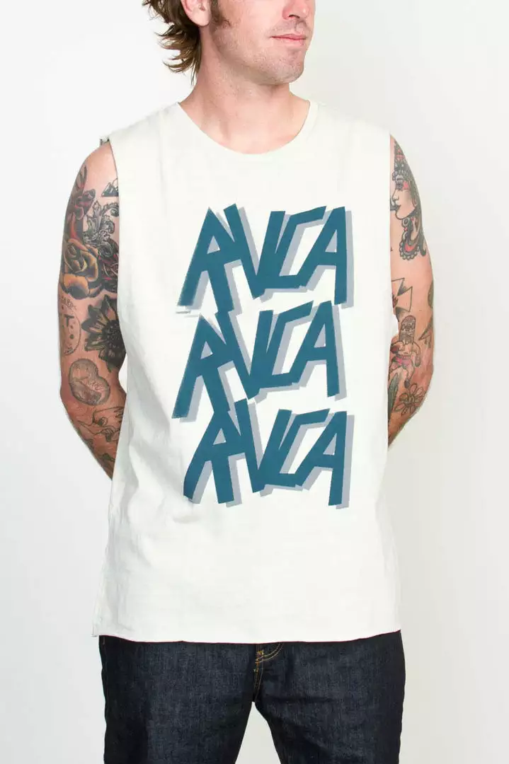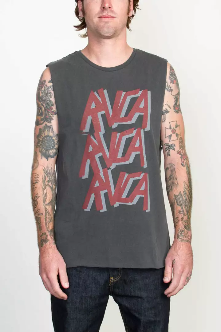 The RVCA Slay RVCA is a regular fit, sleeveless tee with an aged dryhand feel and overdye. The tee has a front screenprint and a screened inside neck.