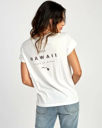 The RVCA Da Aina Fill sends a primo pocket tee into a state of island vibes with a relaxed fit and aloha print. A premium women’s short sleeve t-shirt, the Da Aina fill is cut with a relaxed fit and chest pocket at the left chest. Made with super soft jersey knit, the women’s graphic tee is finished with RVCA’s signature red stitch at the shoulders and custom screen prints from the Hawaii collection at the pocket and center back.