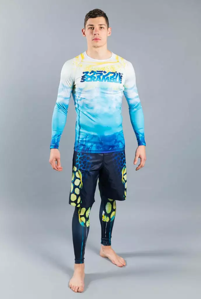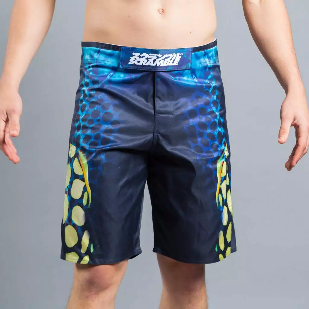 Part of the Pacifica range of jiu jitsu and grappling wear, inspired by the blue skies, clear oceans and marine life of the South Pacific. The bright patterns of the Clown Triggerfish can be seen on these grappling shorts.